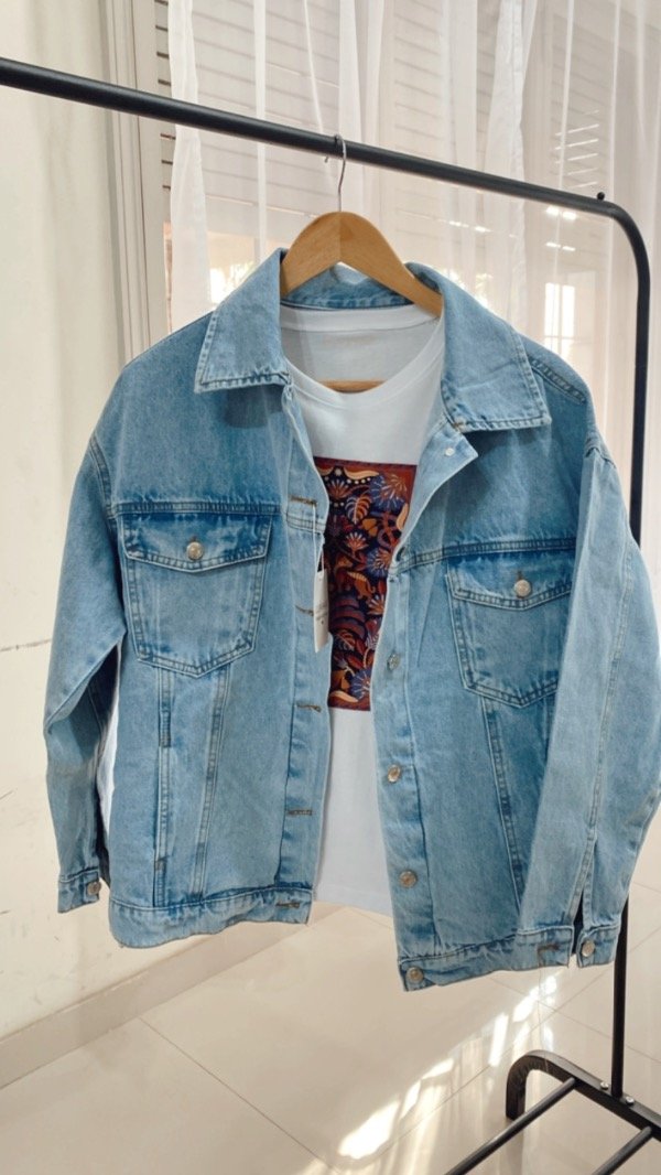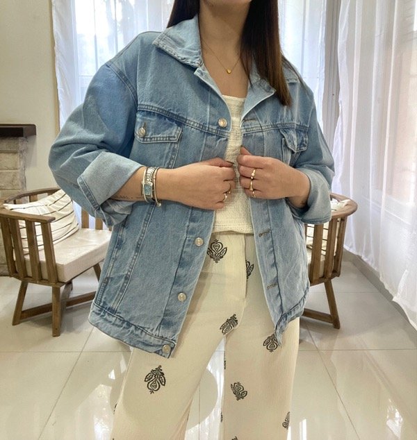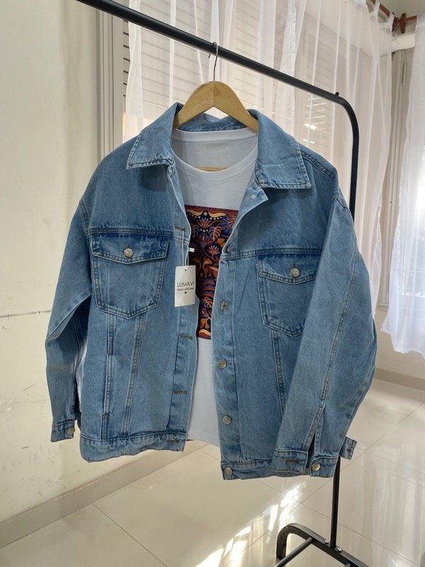 Campe de jean oversize de lavado celeste. Posee bolsillos externos e internos y abarca hasta talle XL aproximadamente