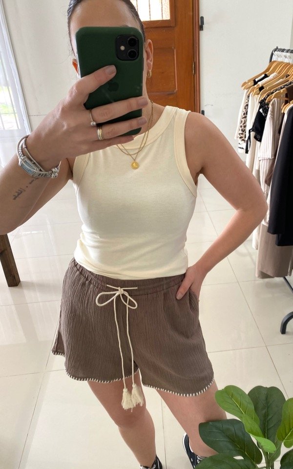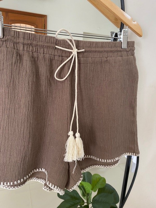 Short de cintura con elástico. Lazo para atar, con terminales. Terminación de botamanga con bordado a contratono. Abarca hasta talle 44