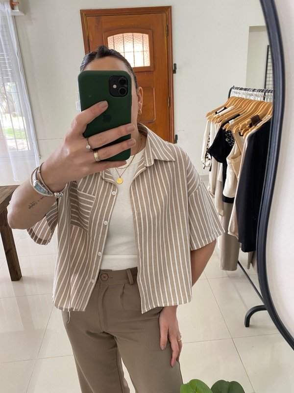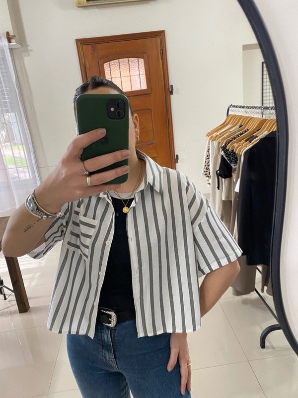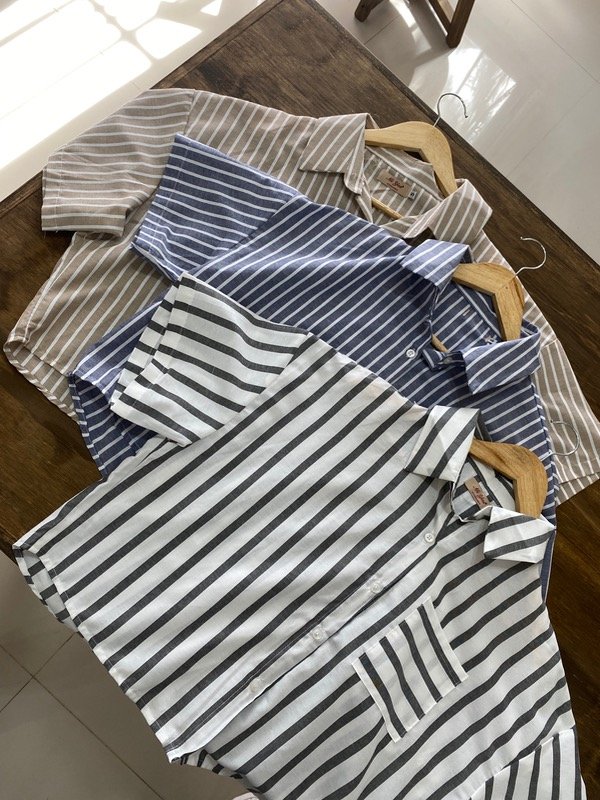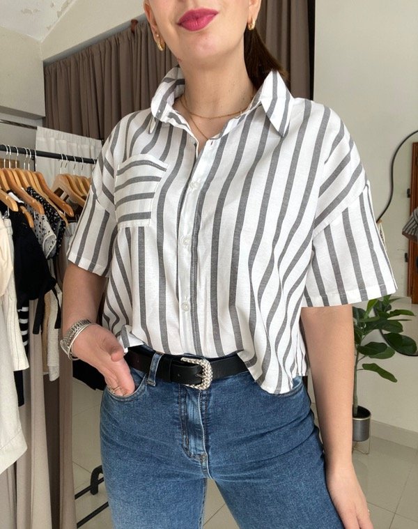 Camisa manga corta de Poplin con estampa rayada y un bolsillo al frente. Abarca del talle M al XL ya que es un modelo amplio!