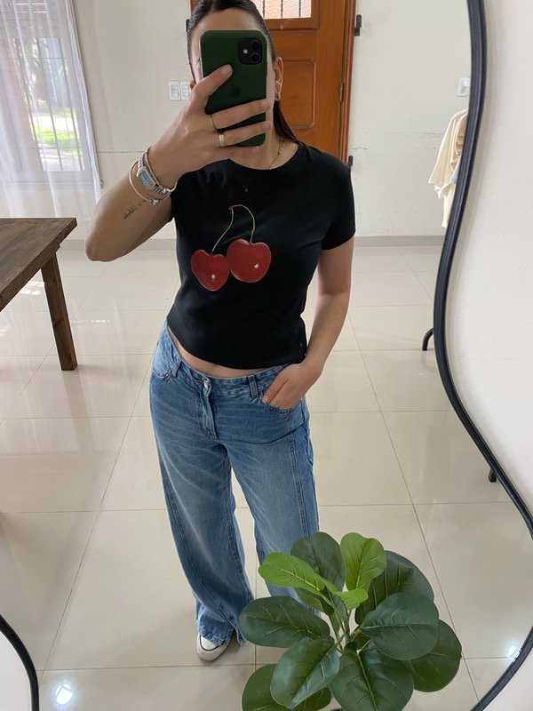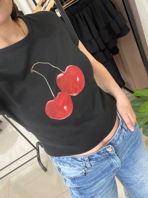 Remera de algodón con lycra con estampa de cerezas. Talle S/M tener en cuenta que es un modelo más bien al cuerpo.